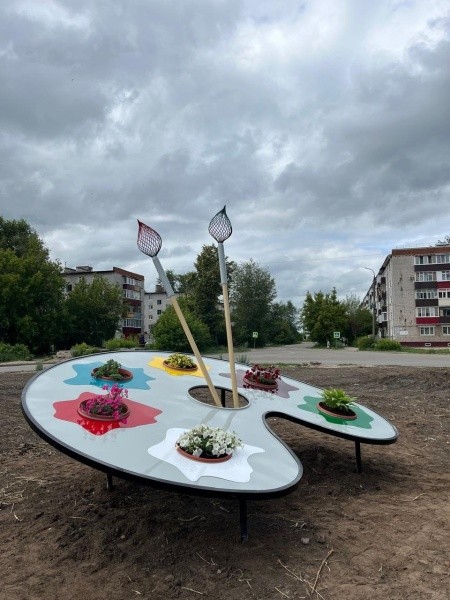 На месте самих красок на палитре уже расположились кашпо с цветами. Об установке необычной композиции рассказала на своей страничке «ВКонтакте» директор школы №4 и общественный деятель Марина Янковская.