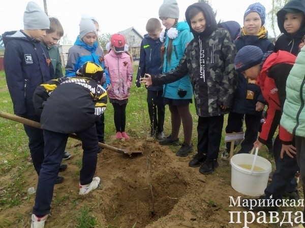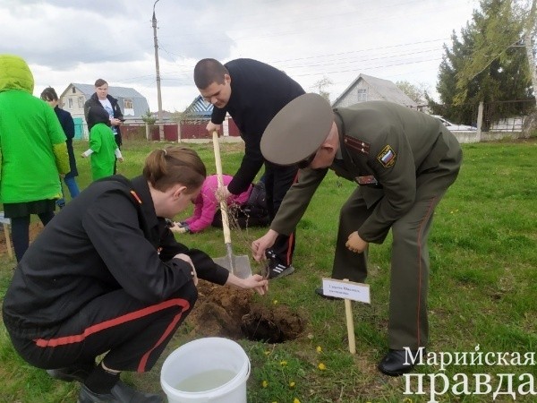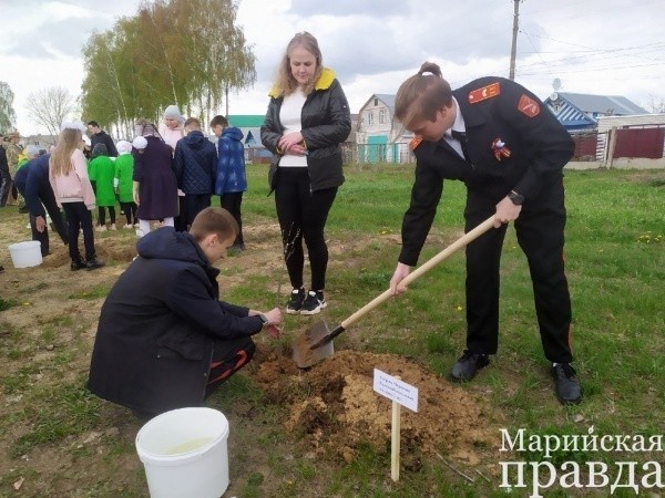 В посадке деревьев приняли участие ученики младших и кадетских классов, воспитанники экологического объединения школы. В этом им помогали ветераны боевых действий, представители администрации, национального парка «Марий Чодра» и Алексеевского лесничества, педагоги волжского детского экологического центра и самой школы, волонтеры Победы.