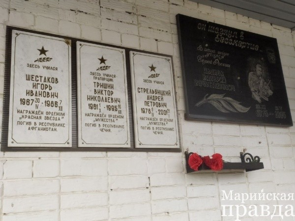 Это Игорь Шестаков, погибший в Афганистане и награжденный орденом Красной Звезды. Выпускник – первый Герой России в Марий Эл Валерий Иванов. Здесь также учились Виктор Тришин и Андрей Стрельбицкий, героически погибшие в Чечне, награжденные орденами Мужества.