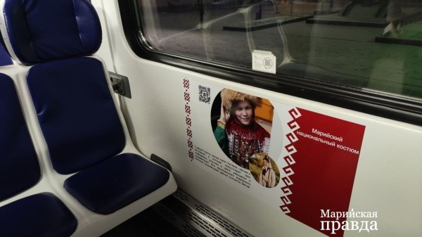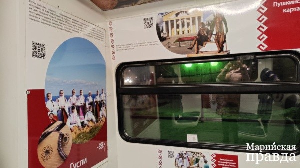 Внутри брендированного вагона - информация о достопримечательностях нашей республики, национальных блюдах и музыкальных инструментах, а также о главных культурных событиях региона. Например, путешественники могут получить краткую информацию о замке Шереметева, Козьмодемьянском музейном комплексе и Царевококшайском кремле, прочитать об одном из символов марийской культуры - гуслях и узнать, что такое уяча и подкоголи.