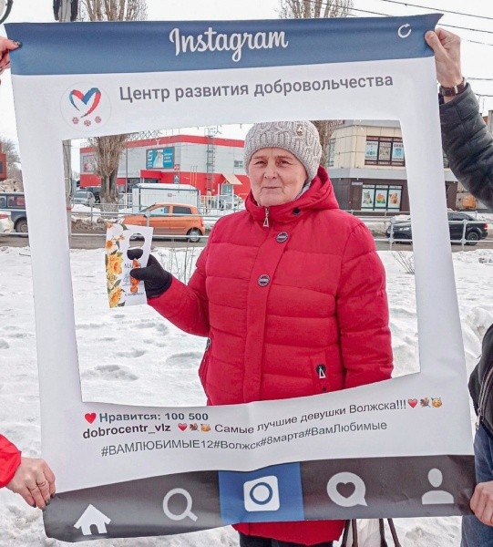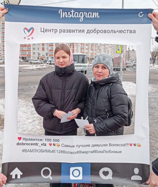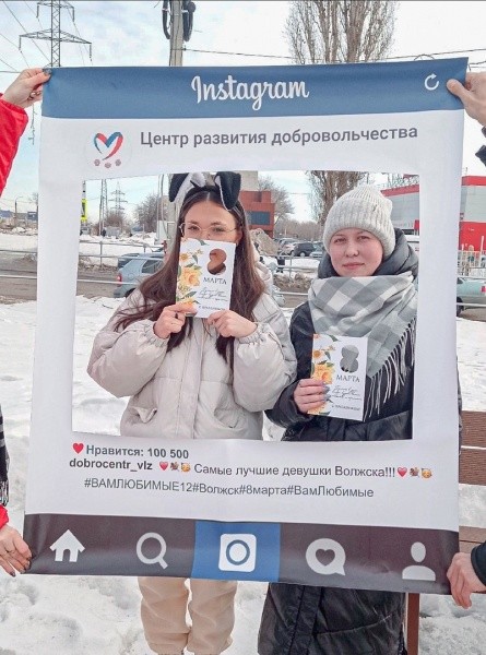 Волонтеры городского Доброцентра возле сквера «Сердце города» вручали женщинам открытки, конфеты, а также предлагали сделать необычные фото. На большой рамке была нанесена надпись «Самые лучшие девушки города Волжска».