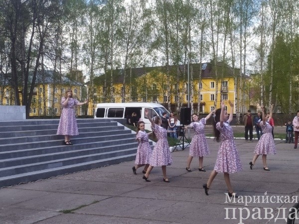 Возле обелиска всех ожидал небольшой сюрприз. Участников за их активность поблагодарили творческие исполнители города, которые подготовили музыкальные композиции военных лет. Также волонтеры Победы вручили всем присутствующим Георгиевские ленточки.
