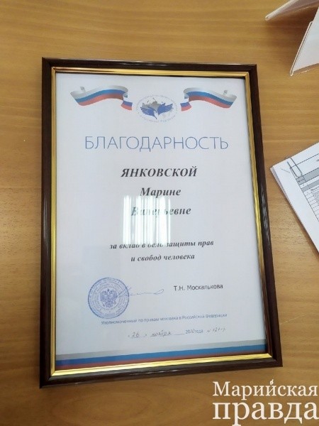 Волжанка отмечена за вклад в дело защиты прав и свобод человека. Почетную грамоту Марине Янковской вручил мэр Волжска Рафис Шагвалеев на очередной сессии горсобрания, которая состоялась сегодня, 20 апреля.