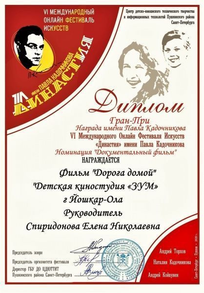 В номинации «Документальный фильм» от детской киностудии "ЗУМ" Йошкар-Олы был представлен «Дорога домой» (авторы Фалалеева Анастасия, Мельникова Анастасия, Бахтина Яна, Гайнутдинова Полина, Шевелькова Софья, Лавров Михаил, Косарева Виктория, Фалалеева Анна), который дети сняли в 2019 году. Жюри высоко оценило работу и присудило нашим ребятам Гран-при.