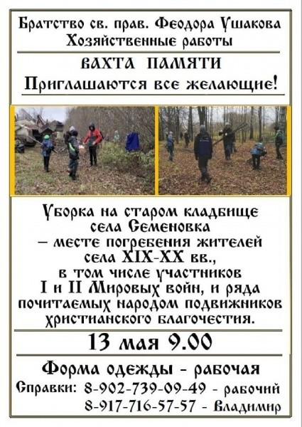 Братство св. прав. Феодора Ушакова 13 мая приглашает жителей республики помочь с уборкой старого кладбища в селе Семеновка.