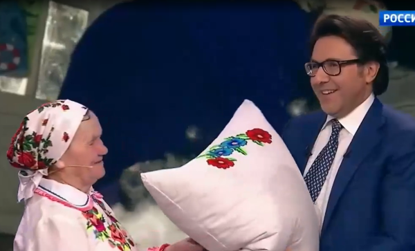Лидия Павловна подарила ведущему Андрею Малахову вышитую подушку, в которую пошел пух девяти гусей, и веники для бани.