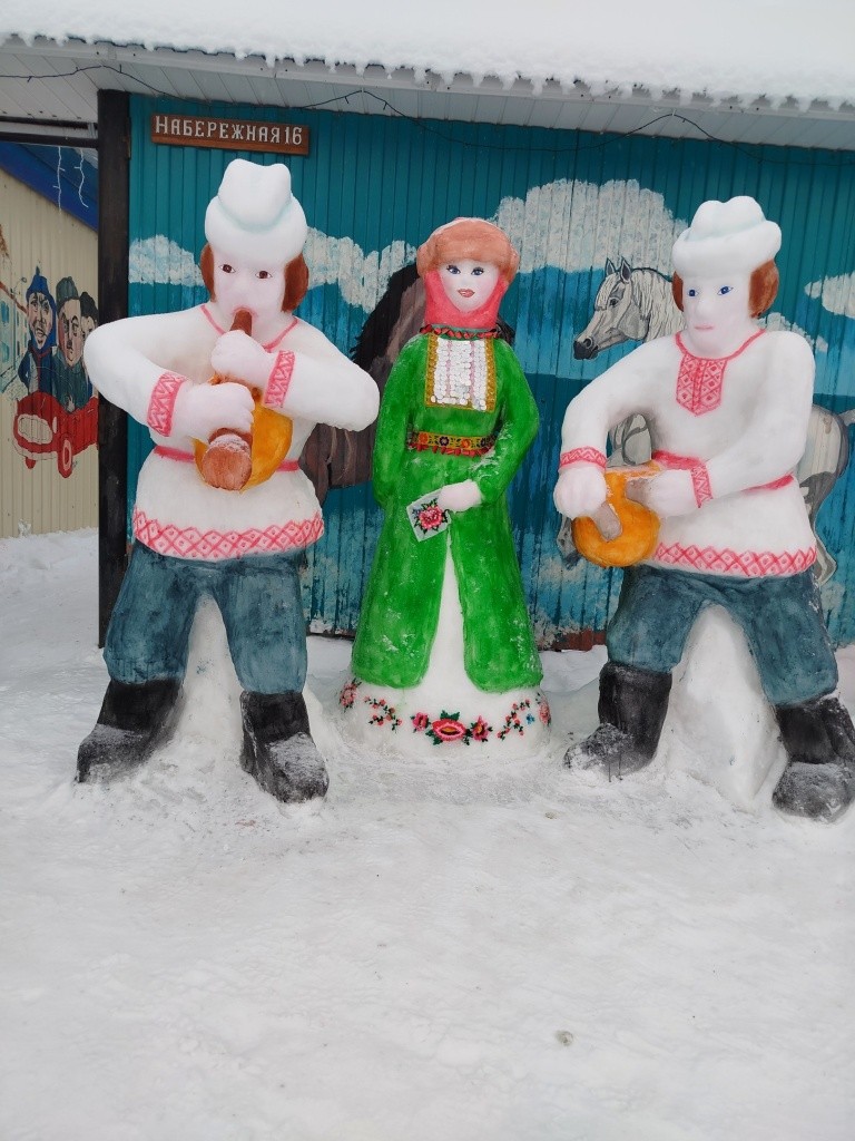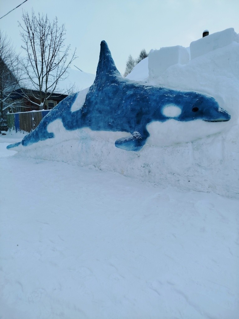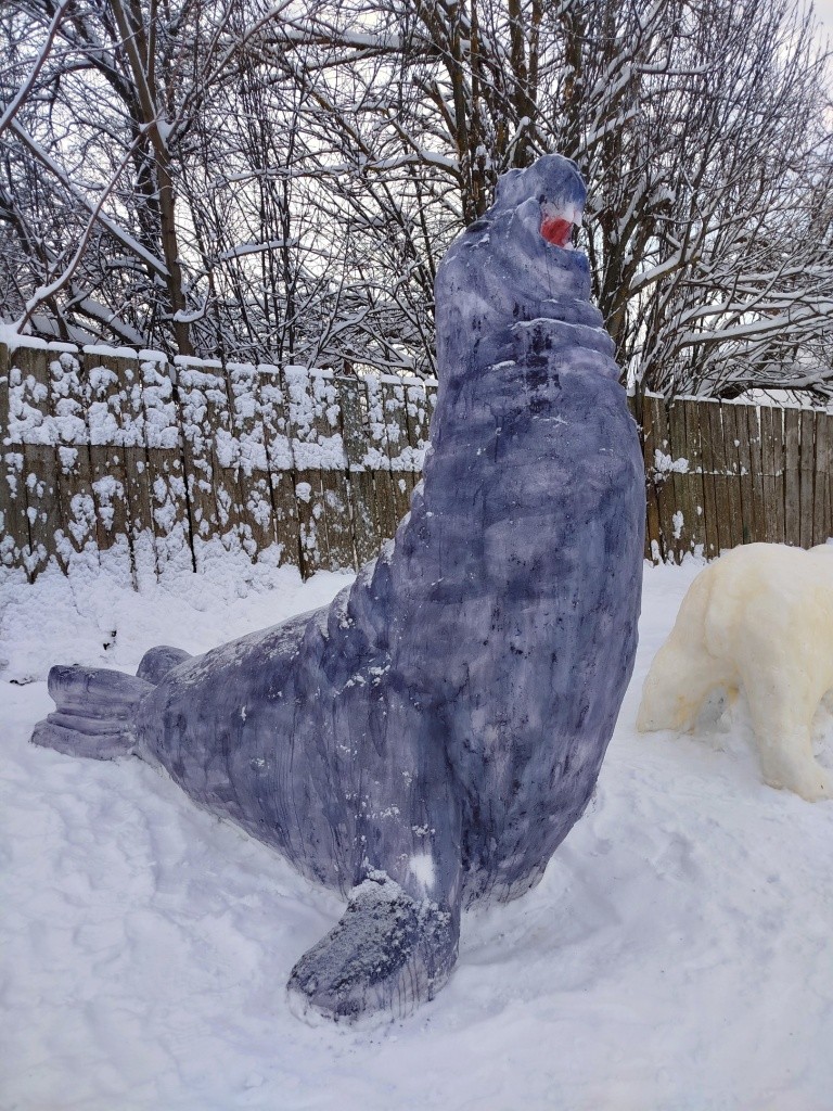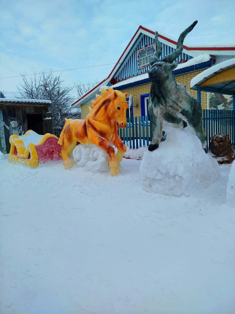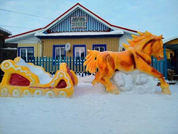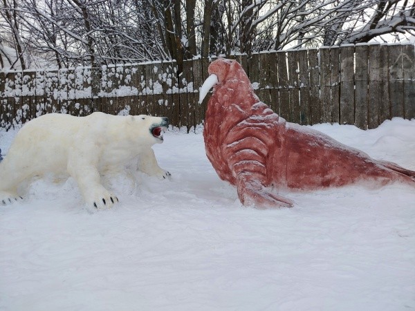 Возле своего дома они традиционно создают галерею снежных скульптур. В этом году здесь «поселились» белый медведь, морж, северный олень, бизон, тюлень, а ледяную горку «охраняет» акула. Конечно, не обошлось и без новогодних героев – Деда Мороза и Снегурочки, а рядом с ними – символ наступающего 2026 года – лошадь.