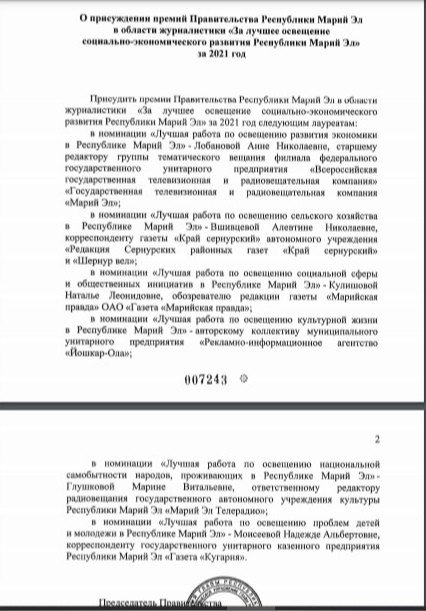 Глава Марий Эл Александр Евстифеев присудил премии Правительства республики в области журналистики «За лучшее освещение социально-экономического развития Республики Марий Эл» за 2021 год. В числе лауреатов − журналист газеты «Марийская правда» Наталья Кулишова!
