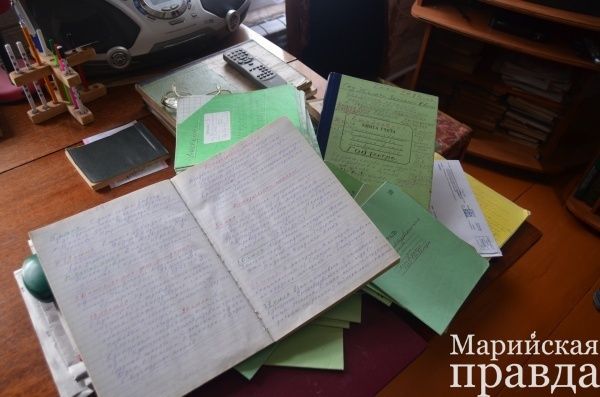 Несколько полок в шкафу заставлены разноформатными блокнотами, ежедневниками, «амбарными» книгами, школьными тетрадями. В них записи о жизни кукнурской стороны.