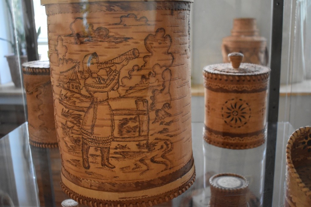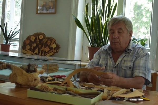 Даже сквозь маску в музее чувствуется особый, едва уловимый древесный аромат – так пахнет береста, более сотни работ из которой представлено 72-летним мастером из Медведевского района. Непростым редким делом Владимир Желудкин начал заниматься чуть более 20 лет назад – к ремеслу его привела простая случайность.