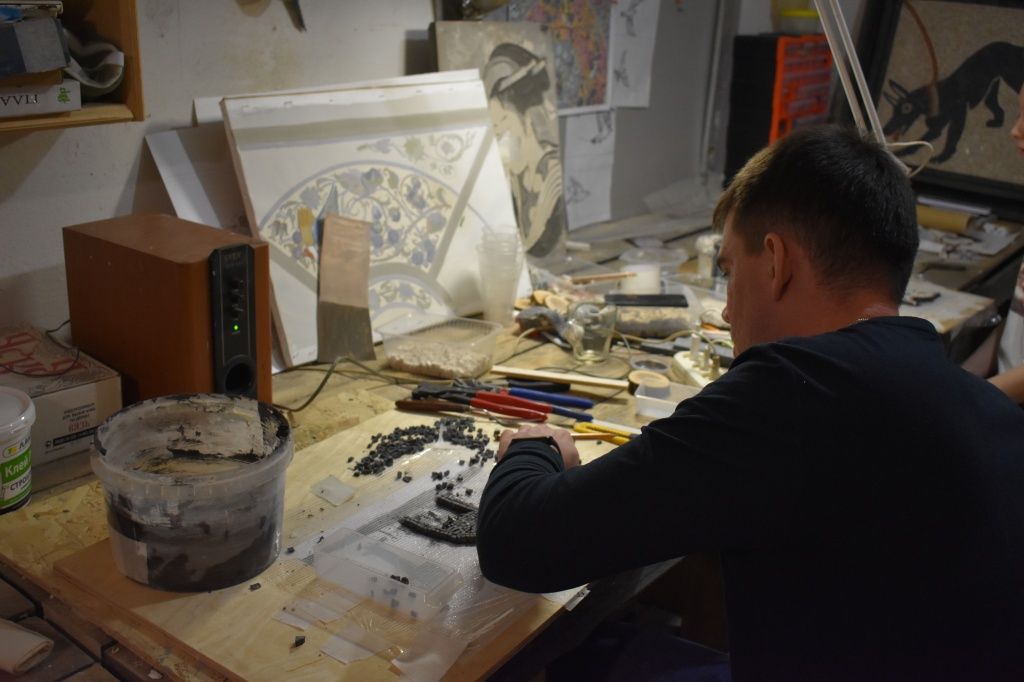 В мастерской двое учеников. Обычно на мастер-классы приходит один человек (так проще объяснить и показать процесс), но сегодня над мозаикой из мрамора корпели двое ребят, одной из них была знакомая Кирилла, художница Марина Плюхина. В такой атмосфере работать как-то приятнее.