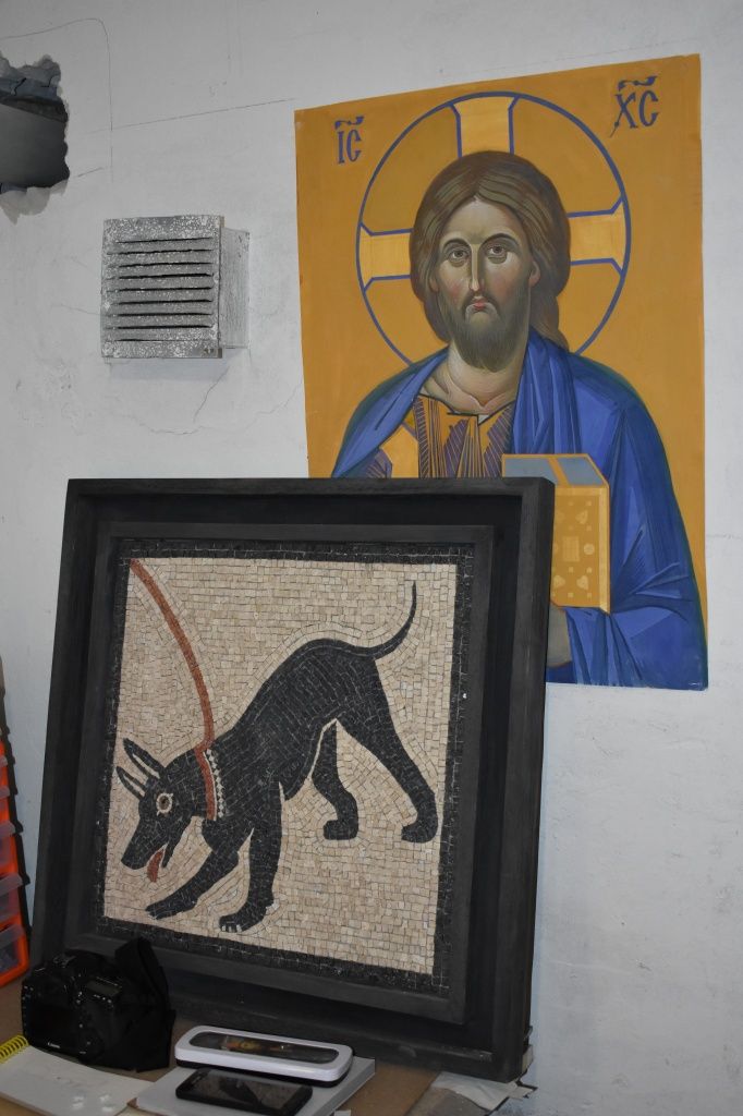 В мастерской художника особые запахи – бетона, пыли, клея, необходимого для составления элементов мозаики, бумаги – особая гамма ароматов. На стенах и столе – работы, которые уже нашли своего заказчика, и те, что еще «ничьи». Здесь есть копия японской гравюры в технике «сграффито», мозаика «Архангел Гавриил», сделанная для выставки «Край марийский» всего за одну неделю, рисунки, выполненные карандашом. Деталей так много, что не знаешь, на что обратить внимание в первую очередь.