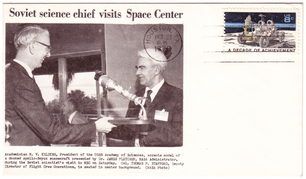 От него же в мою коллекцию добавился очень интересный конверт 1972 года с фотографией, запечатлевшей момент вручения академиком Михаилом Келдышем его американскому коллеге Джеймсу Флетчеру макета состыкованных кораблей – советского «Союза» и американского «Аполлона». Этот международный проект был успешно реализован в 1975 году и отразился в огромном количестве филателистических экспонатов. Но именно тот конверт с оттиском штемпеля города Хьюстона, возможно, является самым первым «почтовым документом» в истории российско-американского сотрудничества.