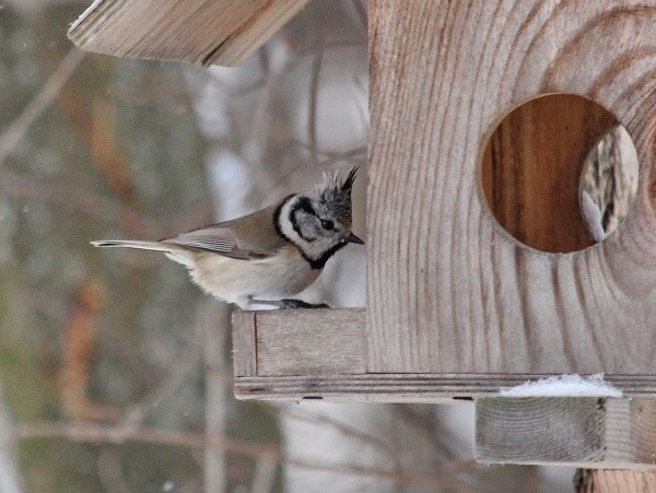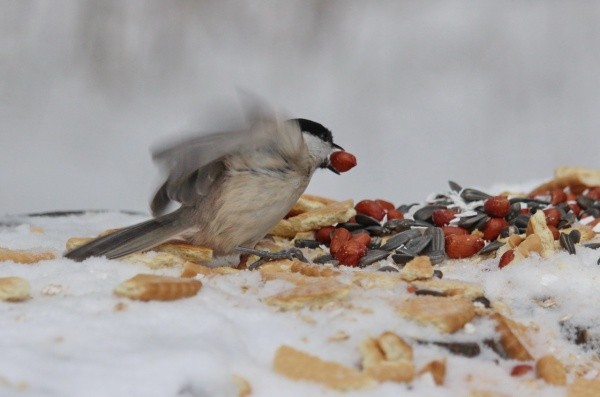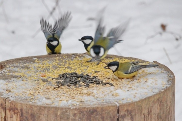 Кажется, что Петр Николаевич знает каждую кормушку в Сосновой роще! Вот у одной на пенек насыпали семечек. Ждать пришлось недолго. Пернатые тут же налетели.