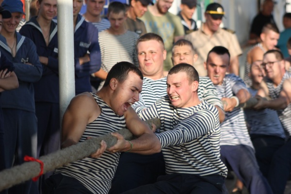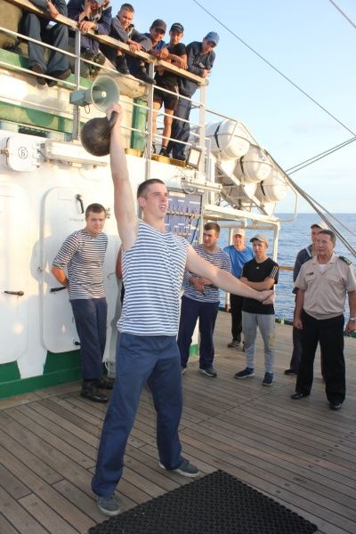 В соревнованиях по отжиманию от палубы вперёд вырвалась команда бизань-мачты. В личном зачёте первым признан Иван Деркач (отжался от палубы 99 раз). Серьёзный вклад в победу команды бизань-мачты внёс юнга Александр Вышкурцев. Он показал всё, чему его научили в «Военно-морской школе выживания «Беркут» города Сургута.