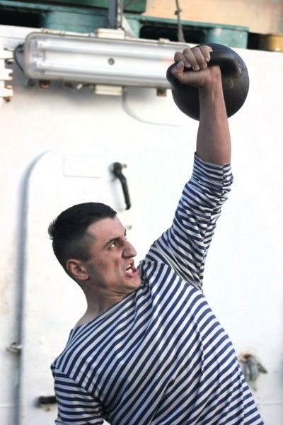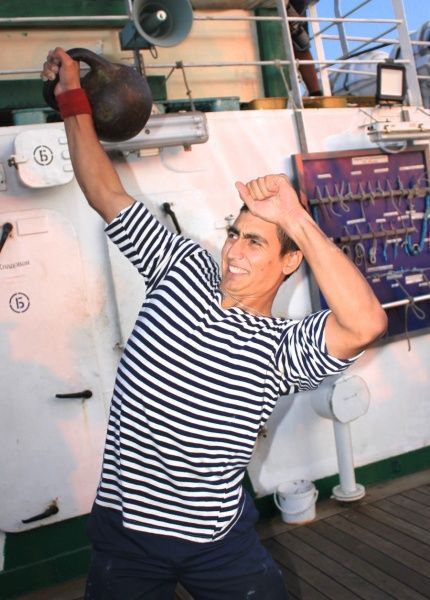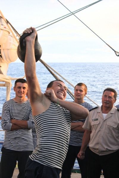Большой интерес у всех кругосветчиков вызвали соревнования по жиму гири весом 24 кг. Страсти накалились, когда в конце состязаний за свои команды наравне с курсантами выступили юнги Николай Ковалёв и Александр Вышкурцев. Они показали, что обладают немалой силой и выносливостью. Результат Ковалёва — 68 раз (в сумме поочерёдно правой и левой руками), Вышкурцева — 70. Лучший результат показал курсант Иван Алиев (81 раз). А в командном зачёте победили курсанты фок-мачты.