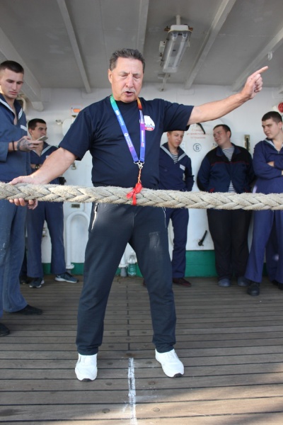 На любом судне шуметь категорически запрещено. В целях безопасности. Нарушение тишины может отвлечь вахтенных, например, от наблюдения за окружающей обстановкой. А тут на протяжении недели по вечерам, в одно и тоже время, обычную тишину на верхней палубе сменяли веселые окрики, хохот и смех участников и болельщиков спартакиады. Спартакиада — тот самый случай, когда из правила делается исключение. При усилении контроля, конечно. Без спартакиады, любимой всеми морской забавы, не обходится ни один учебный рейс, а уж во время кругосветки подобных мероприятий запланировано несколько. На этот раз на корабле проходили флотские состязания между мачтами - фоком, гротом и бизанью.