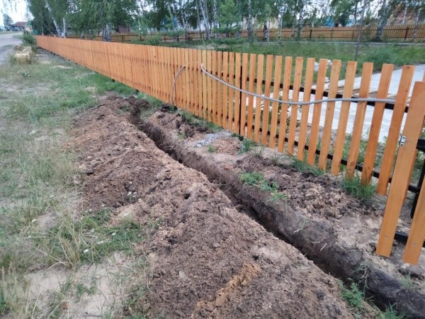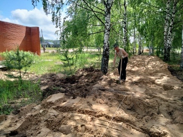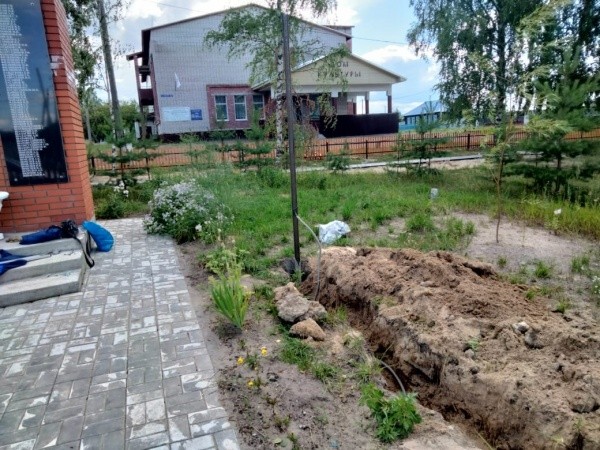 Завершен демонтаж деревянного ограждения, установлены металлические столбы, снят дерн под брусчатку.