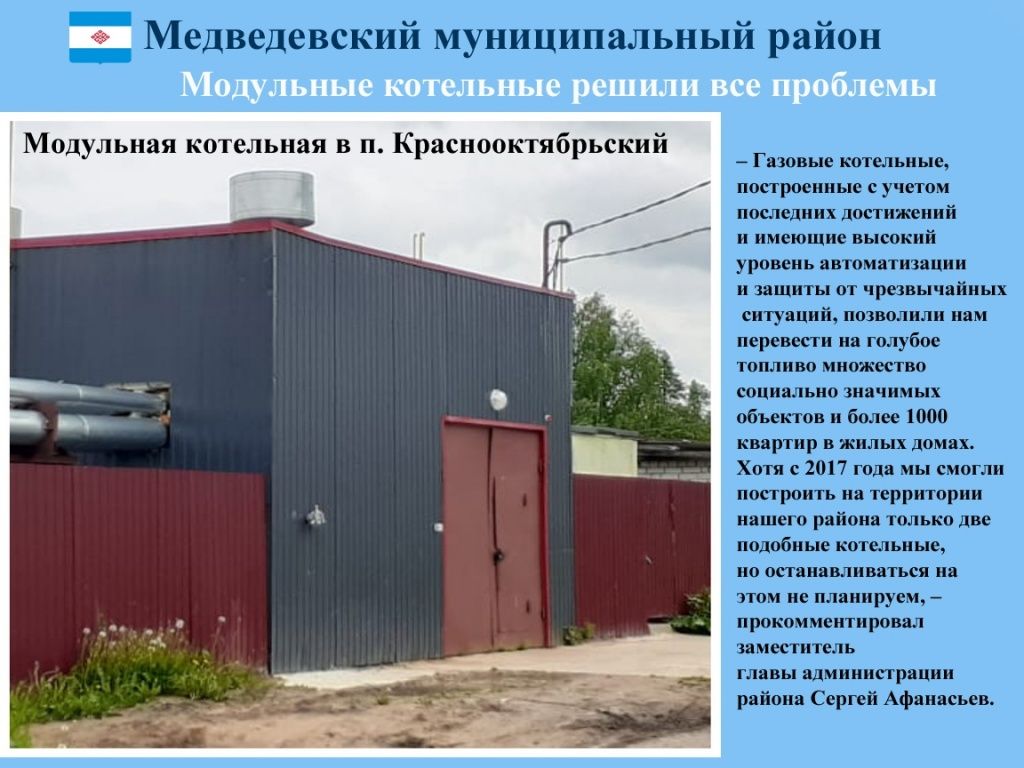 ‒ Моноблочная котельная, отапливаемая природным газом, состоит из двух котлов (отопление) и теплообменника (горячая вода). Чтобы она могла обеспечить теплом всех потребителей, а это порядка 30 многоквартирных домов, частный сектор и объекты соцкультбыта, длина газопровода увеличена почти на километр, ‒ рассказали в администрации Медведевского района.