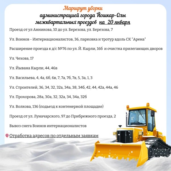 В администрации Йошкар-Олы представили маршрут движения снегоуборочной техники по расчистке межквартальных проездов на завтра, 20 января.