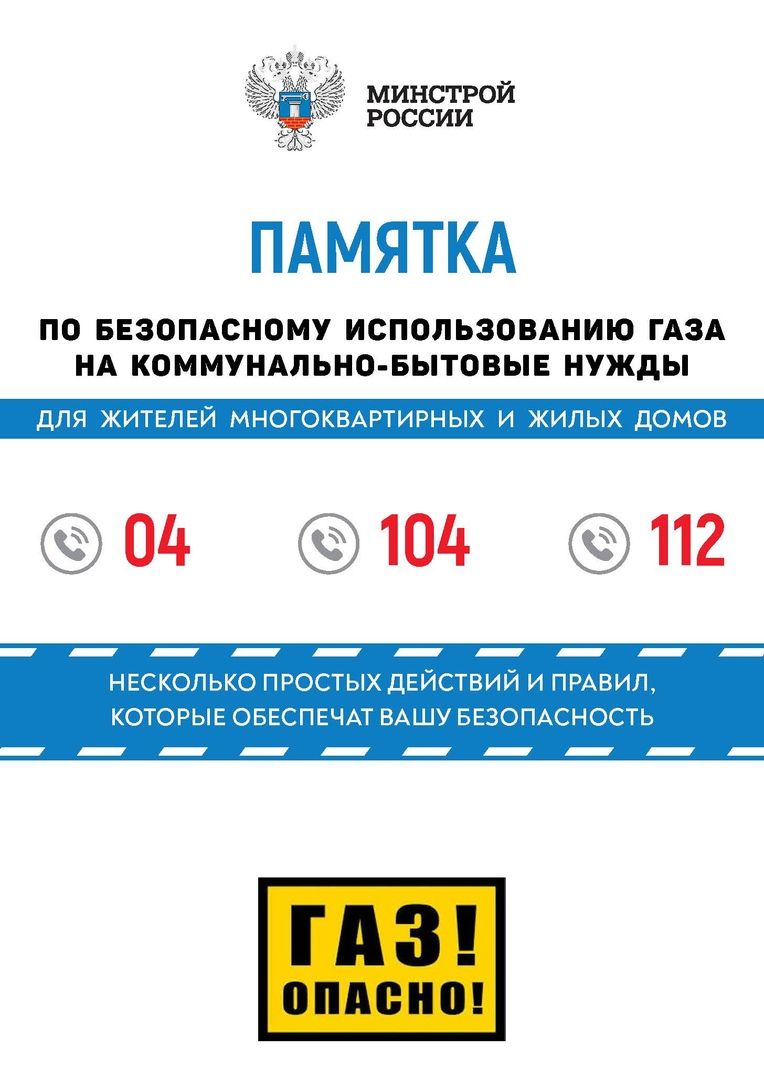 В Минстрое РФ подготовили единую памятку по безопасному использованию бытового газа. Методический материал, создан на основе актуальных предложений от регионов страны. В нем объединены основные рекомендации по эксплуатации газового оборудования в многоквартирных и жилых домах. Памяткой могут руководствоваться как органы жилищного надзора и управляющие организации, так и граждане.