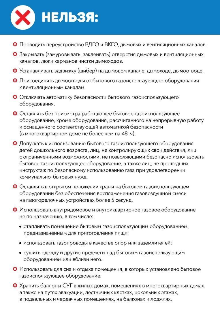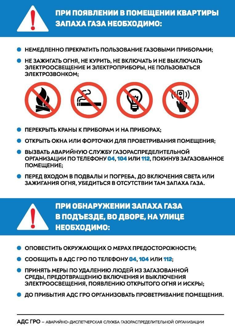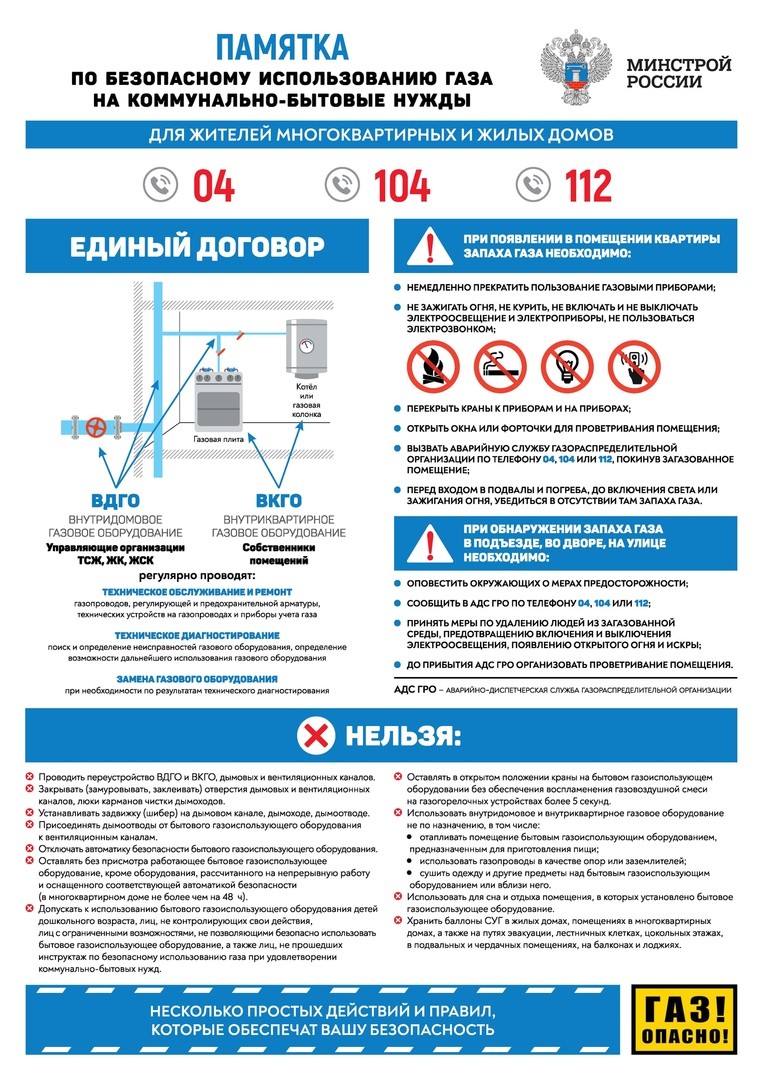 Поэтому Минстрой России совместно с регионами разработал памятку, в которой саккумулированы основные рекомендации по использованию газа в бытовых условиях. Со временем изменился ряд требований, существенно обновилось и само газовое оборудование. В новой памятке собрана актуальная информация о том, какие меры безопасности необходимо соблюдать и как действовать в случае непредвиденной ситуации, указаны телефоны экстренных служб. Отдельным блоком размещен перечень действий, которые категорически запрещены при эксплуатации газового оборудования.
