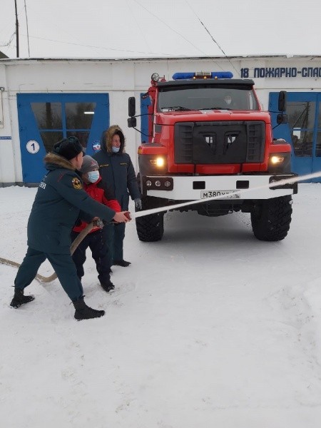 Самым интересным для Георгия, конечно, было посмотреть, что внутри большого красного автомобиля. Так что он без промедления воспользовался возможностью посидеть за рулем пожарной машины. После огнеборцы продемонстрировали мальчику, как прокладывают рукавную линию, подают ствол с водой и тушат условный пожар. Ну а в конце экскурсии юному гостю вручили подарки, которые будут напоминать ему о дне, наполненном положительными эмоциями и новыми знаниями.