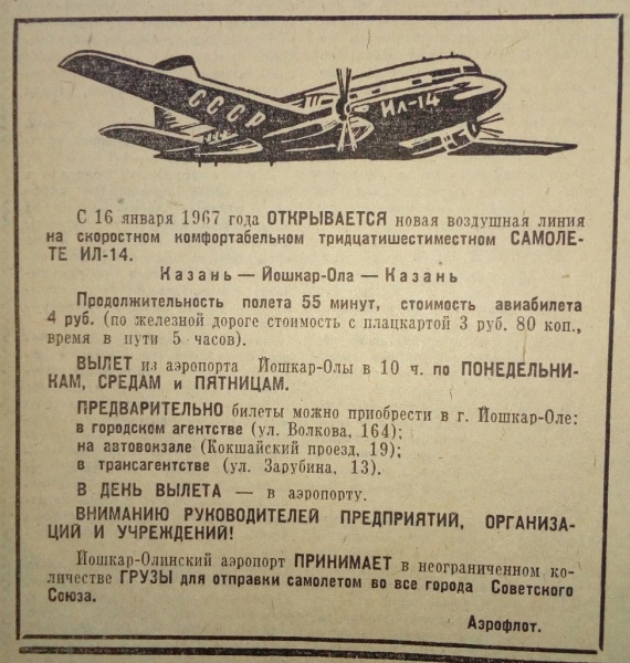 16 января 1967 года между Казанью и Йошкар-Олой «открылась новая воздушная линия на скоростном комфортабельном тридцатишестиместном самолете ИЛ-14». Именно так об этом было написано в «Марийской правде» за несколько дней до важного события в сфере пассажирских перевозок воздушным транспортом.