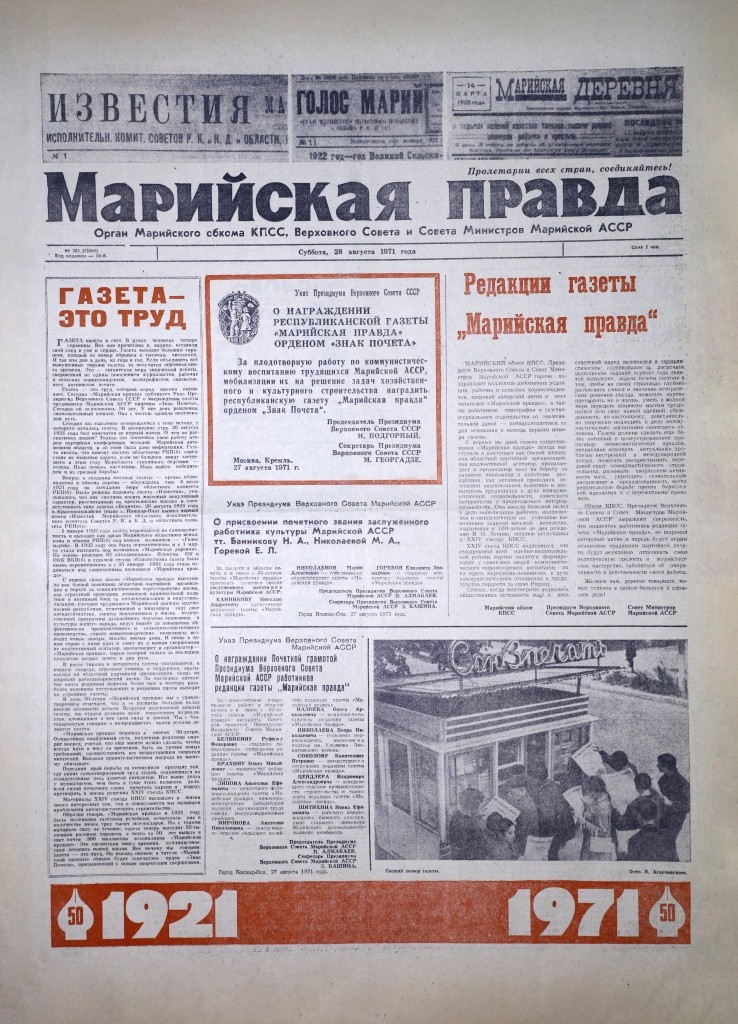 В 1971 году, к полувековому юбилею, «Марийская правда» получила свою главную государственную награду – орден «Знак Почета». Формулировка гласила: «За плодотворную работу по коммунистическому воспитанию трудящихся Марийской АССР, мобилизации их на решение задач хозяйственного и культурного строительства».