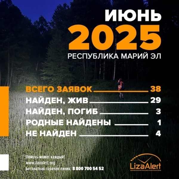 Поисковый отряд «ЛизаАлерт» опубликовал статистику за прошедший месяц. В Марий Эл за июнь этого года обработали 38 заявок на поиск.