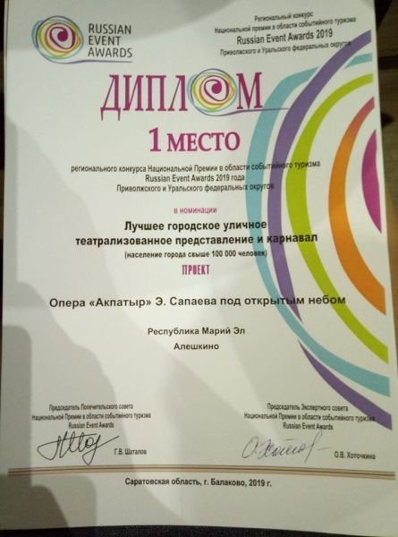 Всего в конкурсе Russian Event Awards 2019 ПФО участвовали четыре проекта из Марий Эл – «Опера «Акпатыр», Спартакиада, Бендериада и фольклорно-этнографический праздник «Земля предков». Проект «Опера «Акпатыр» под открытым небом стал первым в номинации «Лучшее городское уличное театрализованное представление и карнавал среди городов с населением свыше 100 тысяч человек».