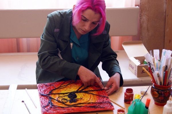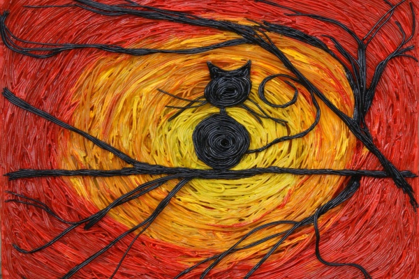 Картина называется «Кот и Закат». Материалом для работы автора послужили мука, вода, клей ПВА, лак и акриловые краски. Выполнила ее москвичка Анна Куропаткина, отбывающая наказание в Марий Эл.