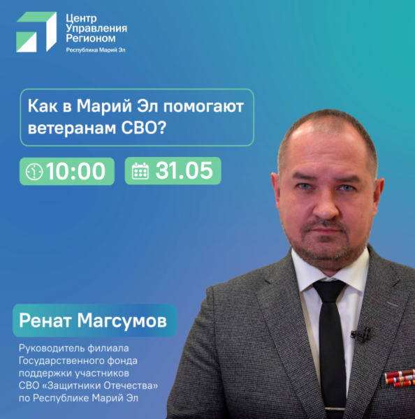 В пятницу, 31 мая, в 10 часов Центр управления регионом Марий Эл проведет прямой эфир на тему, как в Марий Эл помогают участникам СВО.