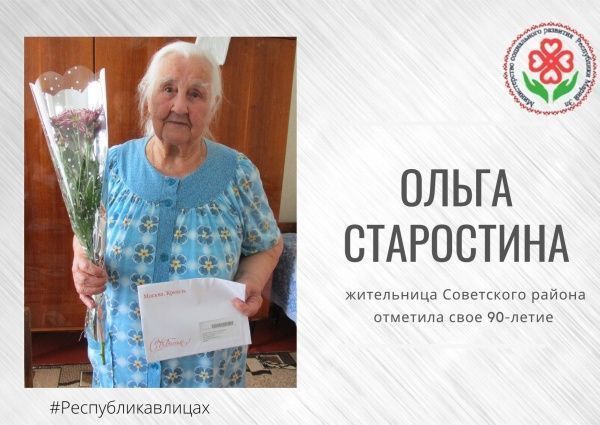 20 июля свое поздравление получила жительница поселка Советский, труженик тыла, ветеран труда Ольга Ивановна Старостина. Женщина отметила свое 90-летие. Представители комплексного центра социального обслуживания Советского района навестили юбиляршу и передали открытку с теплыми словами поздравлений и благодарности от Президента РФ Владимира Путина. Об этом сообщает пресс-служба Минсоразвития Марий Эл.