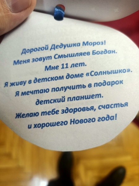 В здании Государственного Собрания Республики Марий Эл сенатор тоже снял с древа шар-пожелание, и на сей раз к парламентарию обратился 11-летний Богдан Смышляев. Вторым домом для ребенка стал знаменитый в Марий Эл детский дом «Солнышко», где к воспитанникам – а это детки-сироты и ребятишки с особенностями развития – добрые сотрудники относятся как к своим родным детям.