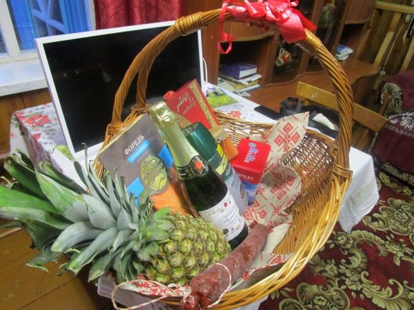 В продуктовом наборе 1990 года лежали колбасы вареная и копченая, консервы – горбуша и кальмар маринованный, банка сельди, шпроты, помидорчики с огурчиками маринованные, икра кабачковая, компот вишневый, чай в бумажной упаковке, бутылка шампанского и водки. Не менее роскошной оказалась и вторая корзина, куда положили большой ананас, «палку» вареной колбасы, три вида копченых колбас, круг сыра, банку кофе, шпрот, оливок, икры лосося, соленую форель, упаковку чая, бутылку шампанского и «горькой».