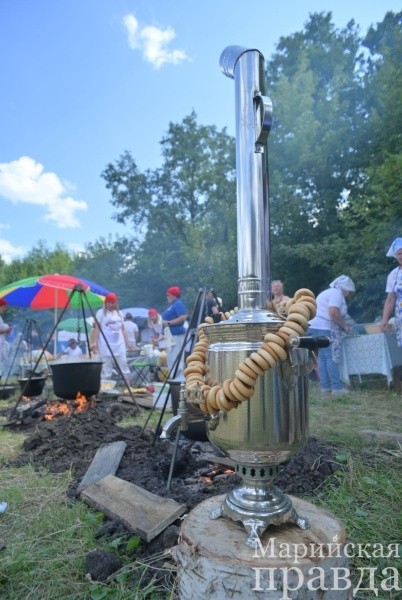 А вот команда из Килемарского района - новичок. Хотя именно Килемарский район достоин того, чтобы называться родиной ухи. Ведь на его небольшой территории расположено множество озер. И без преувеличения можно сказать, что там каждый второй - рыбак. Уха килемарцев - с угольком. Этот продукт древесного выгорания придает особенный привкус рыбному супу. Их слоган звучит так: «Жизнь с огоньком - уха с угольком!»