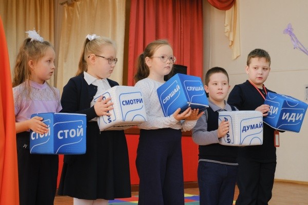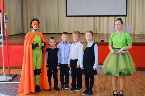 Внимание учеников младших классов принадлежало яркому персонажу по имени Ураганчик и фее Би-бип. Это была не лекция, а интерактивный спектакль. Дети не сидели пассивно, а становились полноправными участниками действия: вместе с героями они «переходили» импровизированную проезжую часть, кидали специальные кубики, решали дорожные задачки и дружно танцевали.