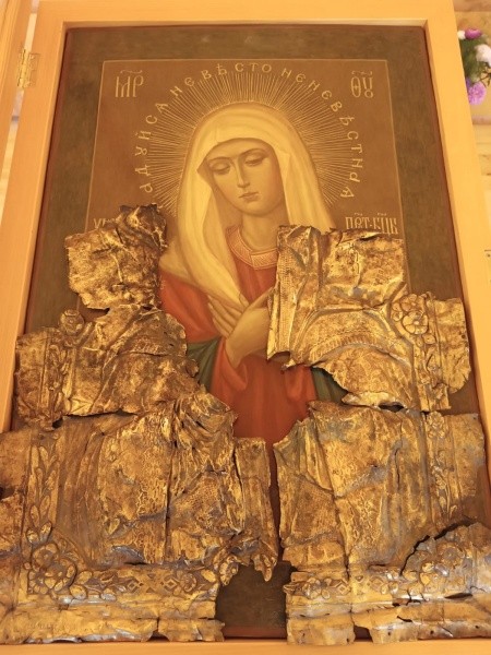 Иконописец-реставратор из Москвы Павел Кокарев на старинной доске 19 века написал икону «Умиление» для чудотворного оклада, переданного нам святой Тамарой. Прекрасный образ Пречистой Девы, написанный для такого случая в Костромской тиши, подарила волжанам москвичка Ирина Жесткова. После литургии состоялось награждение грамотами активных помощников и меценатов. Храм распахнул двери для православных. Здесь, в благодатном месте, в окружении святых образов душа обретёт покой и обратится к Богу.