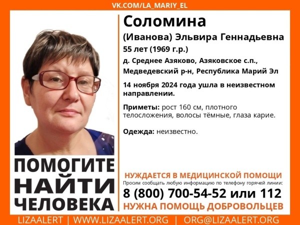 Жительница деревни Среднее Азяково Медведевского района 55-летняя Эльвира Геннадьевна Соломина (Иванова) ушла в неизвестном направлении 14 ноября. Во что была одета неизвестно, но её приметы следующие: рост 160 см, телосложение плотное, глаза карие, а волосы тёмные.