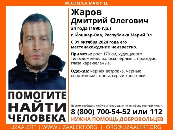 34-летний йошкаролинец Дмитрий Олегович Жаров пропал 31 октября. С тех пор о нём ничего не известно. Мужчина ростом 170 см, худощавого телосложения, волосы чёрные с проседью, глаза каре-зелёные. Был одет в чёрную ветровку, чёрные спортивные штаны и серые кроссовки.