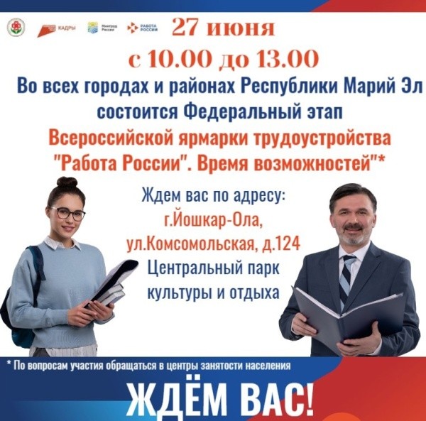 27 июня в Йошкар-Оле пройдет Федеральный этап Всероссийской ярмарки трудоустройства "Работа России. Время возможностей".