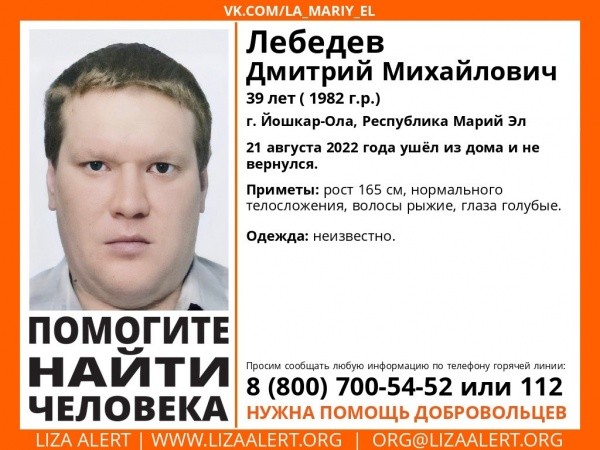 21 августа 39-летний Дмитрий Лебедев ушёл из дома и не вернулся. Его приметы: рост 165 сантиметров, нормального телосложения, рыжие волосы, голубые глаза.
