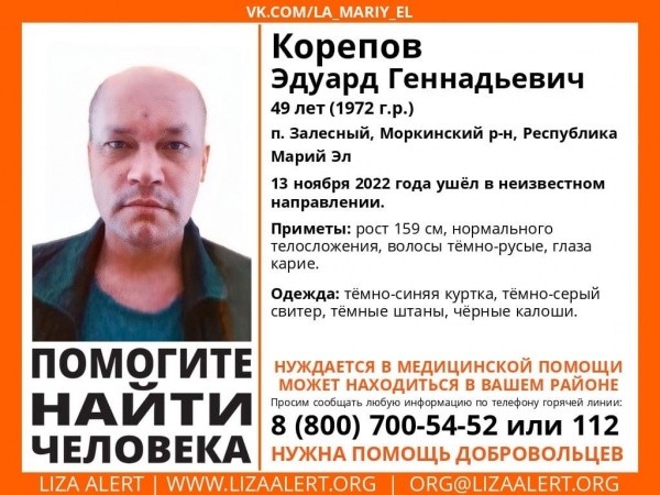 В Марий Эл ищут 49-летнего Эдуарда Геннадьевича Корепова, жителя поселка Залесный, Моркинского района.