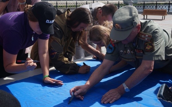 Между прочим, 22 августа в Москве на Поклонной горе будет сшиваться флаг РФ из фрагментов, которые были привезены из разных городов нашей страны. Сегодня, 16 августа, жители республики создали свою часть.