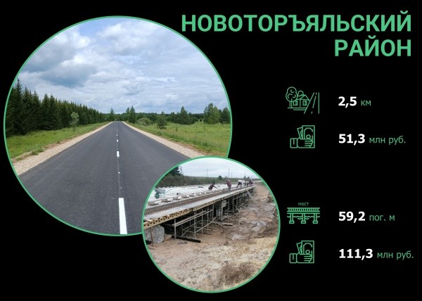 За 2020-2024 годы на территории Новоторъяльского района Марий Эл приведено в нормативное состояние 12 участков дорог регионального и межмуниципального значения общей протяженностью 118,31 километра и 8 мостов протяженностью 329,5 погонных метра, сообщили в Марийскавтодоре.