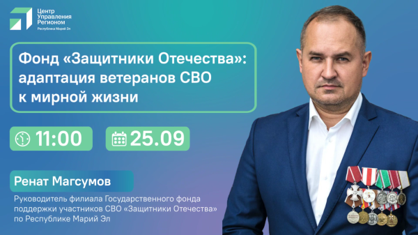 Завтра, 25 сентября, в 11:00 ЦУР Марий Эл проведет прямой эфир на тему адаптации ветеранов СВО к мирной жизни.