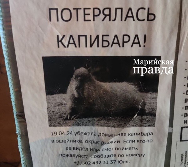 В девятом микрорайоне развешаны объявления о пропаже: «Убежала домашняя капибара в ошейнике, цвет рыжий. Если кто-то ее видел и смог поймать, пожалуйста, сообщите по номеру +7-902-432-31-37 Юля».– Капибары очень похожи на морских свинок, только гораздо больше по размеру. Они живут в болотцах и питаются растительной пищей. Сложно сказать, смогло бы такое животное выжить на улице или нет. Сейчас погода изменчива, на холоде капибара запросто может простудиться – она к таким погодным условиям не приспособлена. Думаю, стоит искать этого зверя около водоемов, их даже называют по-другому водосвинками, – рассказал Сергей Владимирович.