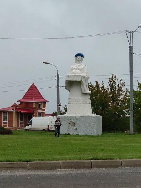 В "голубые береты" посвятили известную скульптурную композицию "Женщина с хлебом" (или "Баба с караваем", как называют памятник в народе). Уже этой ночью голову скульптуры украсил голубой берет.