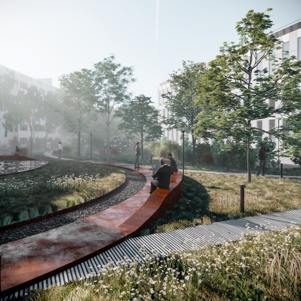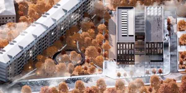Согласно плану, здание будет состоять из двух офисных блоков, которые будут соединены центральной частью. Рассмотрев детали проекта, можно увидеть, что вокруг офиса будущего запланирован небольшой парк с освещением.